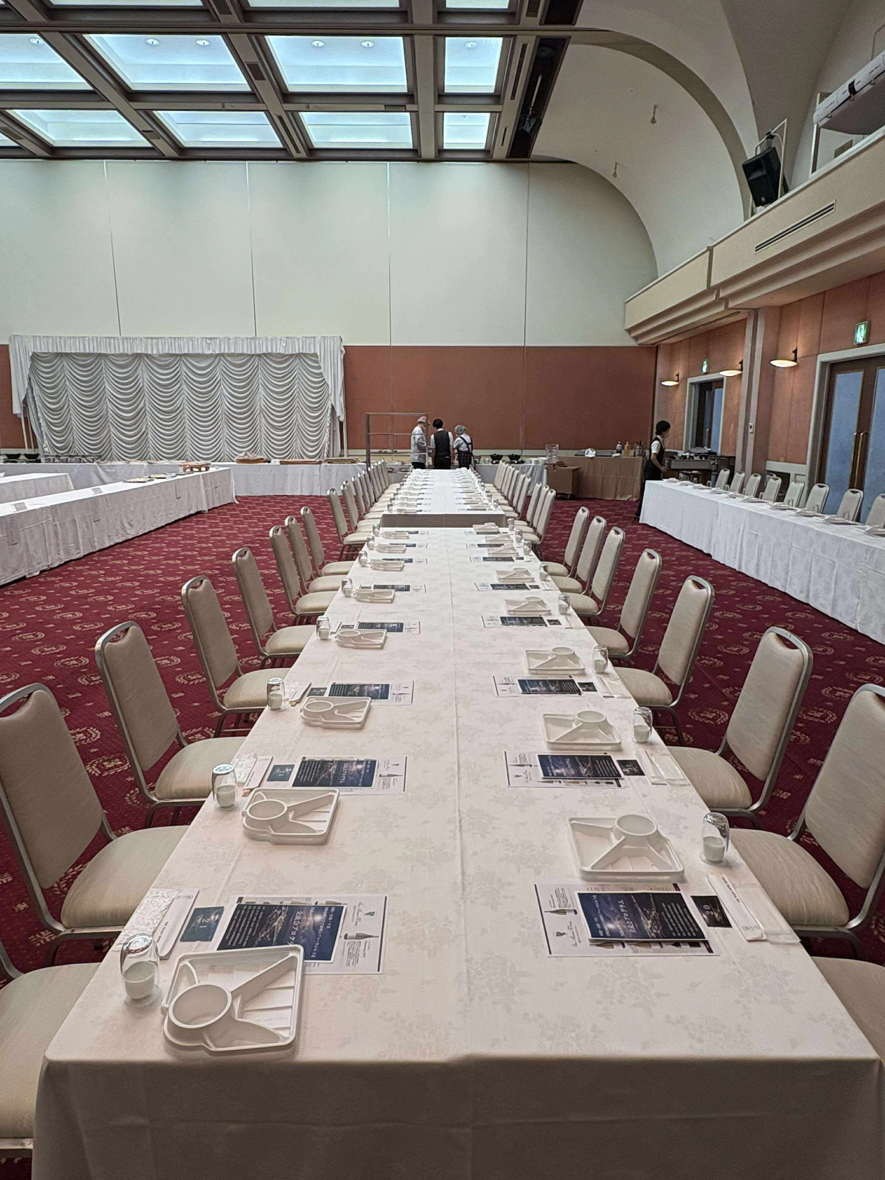 参加者の皆さんは、受付と同時に割り振られた座席へ。一緒に来場した方々は近くの席でしたが対面や反対隣には初めましての方々。立食パーティだと近くにいてもわざわざ初対面の人に話しかけることは難しいですが、ロングテーブルで物理的距離が近いこと、テーブルを介して「つながっている」ことが心理的ハードルを下げて、初めましてをしやすくしているな、と見ていて感じました。今後このロングテーブルであること、による参加者のコミュニケーションや心理的ハードルがどう変わるのかは実証実験していきたいです。