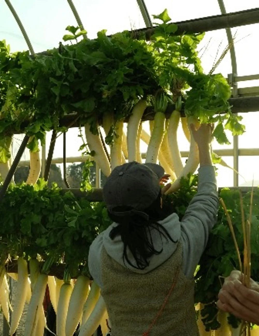 まだ土をまとった大根を水で洗い、出荷されない比較的小ぶりなものを天日干しします。その方法はいたってシンプル...ですが、ちょっとしたコツが必要です。まずは同じくらいのサイズ、重さであると思われる大根を1ペア見つけ出します。そして5,6本の藁を手に取り、これでうまく大根の葉の部分を縛って、吊り下げられるようにします。一連の作業は、ほとんどの人が初めての体験でしたがそのうち自然と「水洗い担当」「ペアの大根見つける担当」「藁を柔らかくする担当」「2つの大根の葉を縛る担当」「干す担当」など役割分担がなされていき日が沈む前に終えることができました。