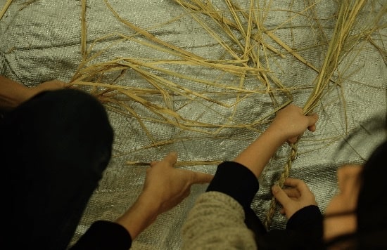 ある程度藁が柔らかくなってきたら、藁を二等分してねじりながら、均等な太さになるように編んでいきます。これが想像以上に難しく各々個性的な形が出来上がっていきました。一緒にお邪魔したメンバーの中で、幼い頃に教わりながら実際に編んだことのある人がいまして、彼女の編むしめ縄はとっても綺麗でした。