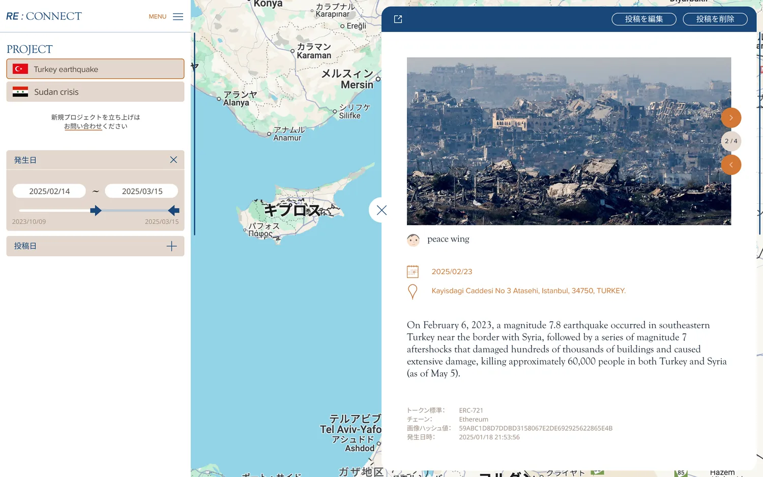 "Redefining Human Connection" をコンセプトとしたWeb3プラットフォームを開発し、世界のつながりを描き直すプロジェクトです。紛争や災害に直面する課題当事者が提供する「情報」と、その情報を受け取った人の「支援」を繋げ、継続的に課題解決に向けたアクションを生み出します。世界で今起きていることを正しく知ることから課題関与者を増やし、人と人の繋がりを再定義しながら世界を描き直していきます。