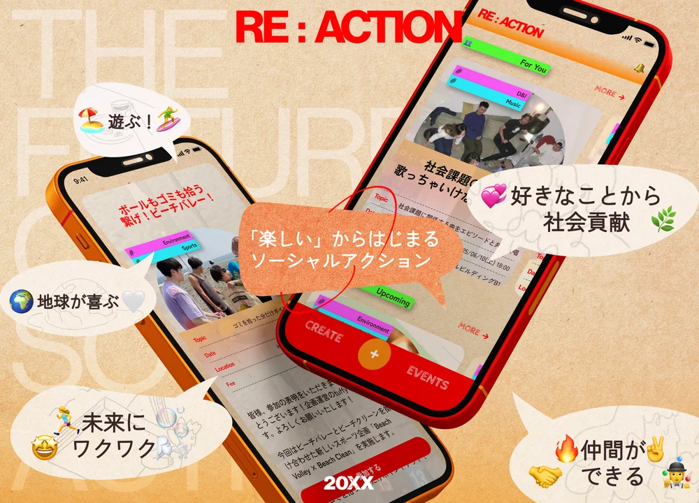 RE:ACTIONではこれまでのソーシャルアクションのイメージを変え、普段のアクションを捉えなおし(RE)、自分の好きなこと、楽しい・ワクワクする・面白いこと、センスがあること、ハマっていることなどポジティブな感情と紐づけたソーシャルアクションイベントを提供していくプラットフォームです。