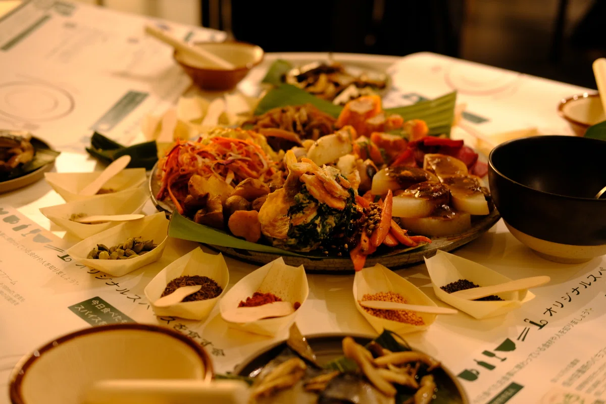 QH+では常時8種近くの無国籍おばんざいが用意されていて、国内の有機農家さんから直送のお野菜と多種多様なスパイスを組み合わせた美味しさの発見が溢れるお店です。今回のロングテーブルでも11種のおばんざいをご用意いただき、南美さんが普段から愛用しているスパイスも14種小分けで提供。どんな特徴を持ったスパイスなのか、ご説明のもと、参加者それぞれで好みの組み合わせのデュカを作るワークも行いました。